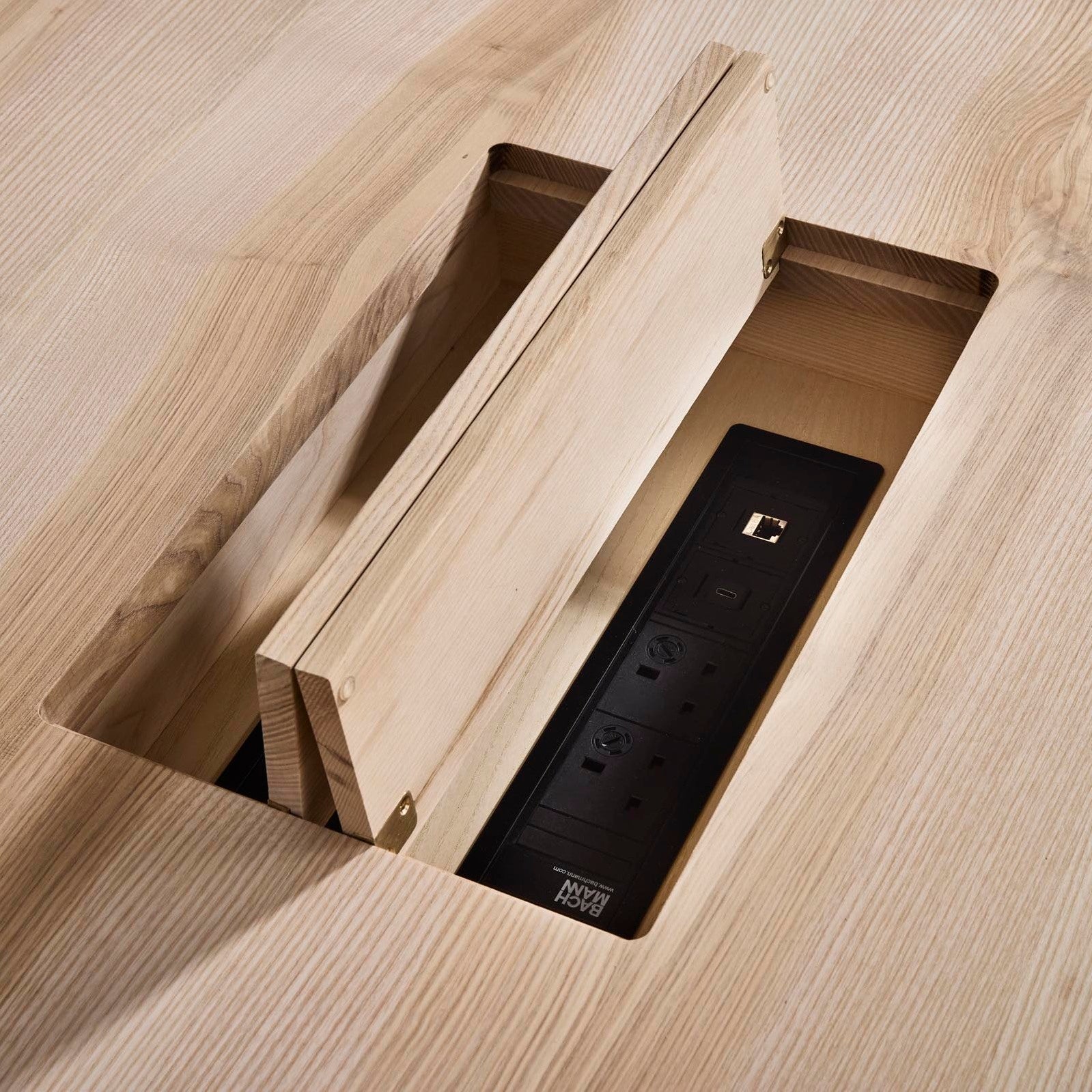 The AYA Conference Table is offered with a D-Ended  or Square-Ended shape. It is available with surface and/or beam mounted power; or alternatively set within a trough with a hinged lid.  Cables are managed down the leg with a lift off panel.