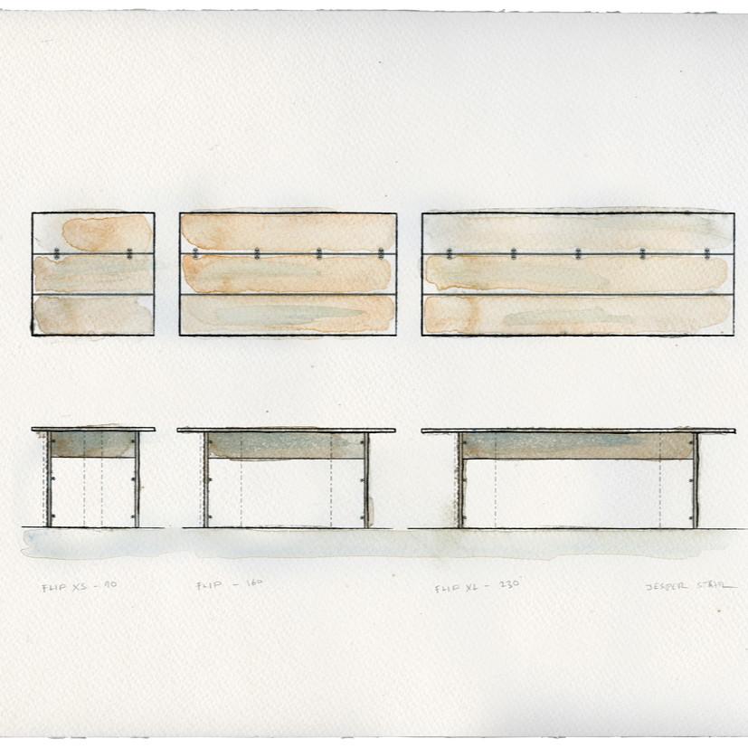 With the Flip Table, Jesper Ståhl solves a common problem for those who live in small homes. It's not one table, but three: a dining table, desk and sideboard. But who buys all three these days? Finding a solution was a challenge that took a lot of experimentation, and 14 hinges! Its composition gives the table a different aspect, depending on how it's set up. It folds lengthways to create three different sizes.