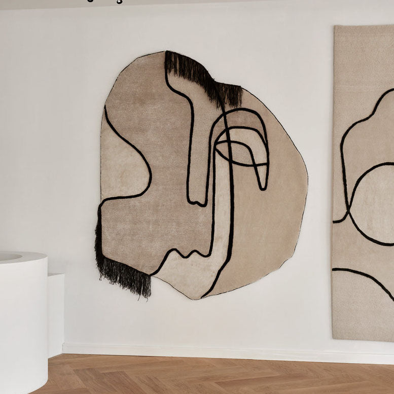 Dynamic black lines create a graphic framework in Slanted Self, with strong facial features emerging in the interaction between the contrasting materials, colours and textures. Crafted from a mix of New Zealand wool, mohair and silk, all selected for their natural qualities, Slanted Self brings both visual and tactile appeal to its surroundings.